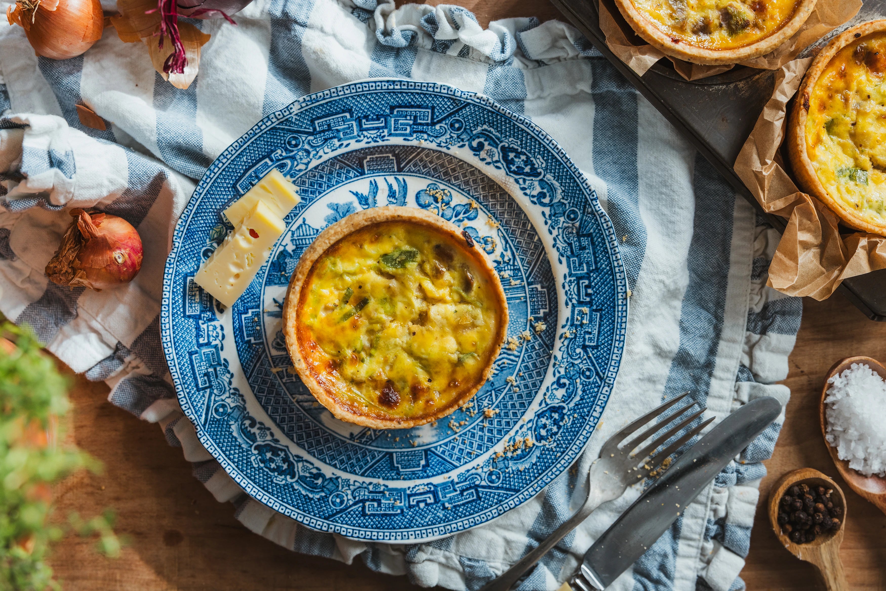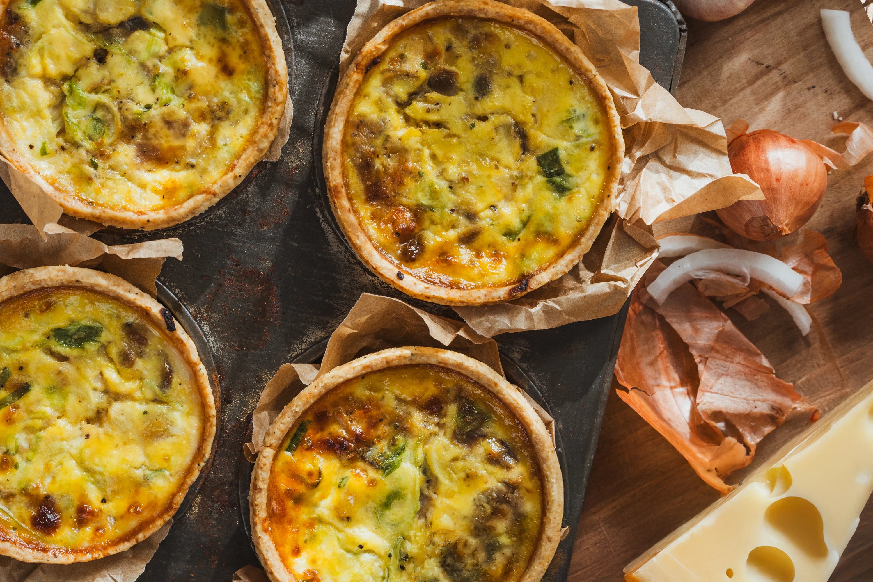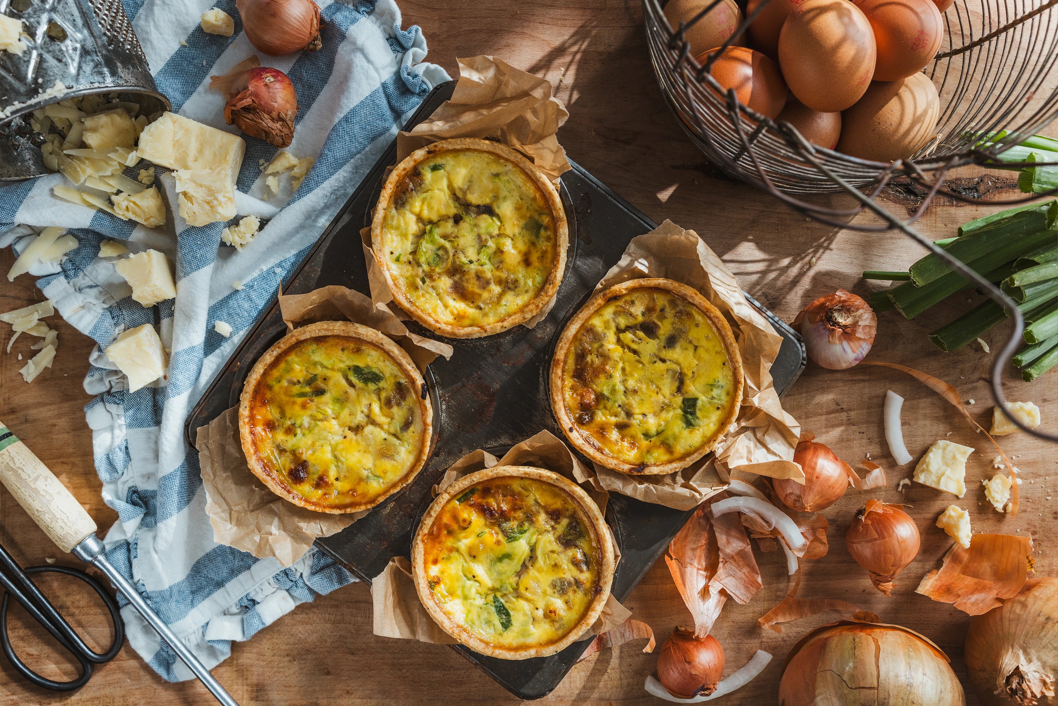 This classic vegetarian tart starts with a buttery shortcrust pastry base, delicately infused with cracked black pepperand mature British cheese to create a crisp, golden, and flavourful foundation. Inside, a rich, creamy egg custard is generously blended with mature cheddar cheese, sweet red onions, and fresh spring onions, offering a perfectly balanced mix of savoury depth and subtle sweetness.