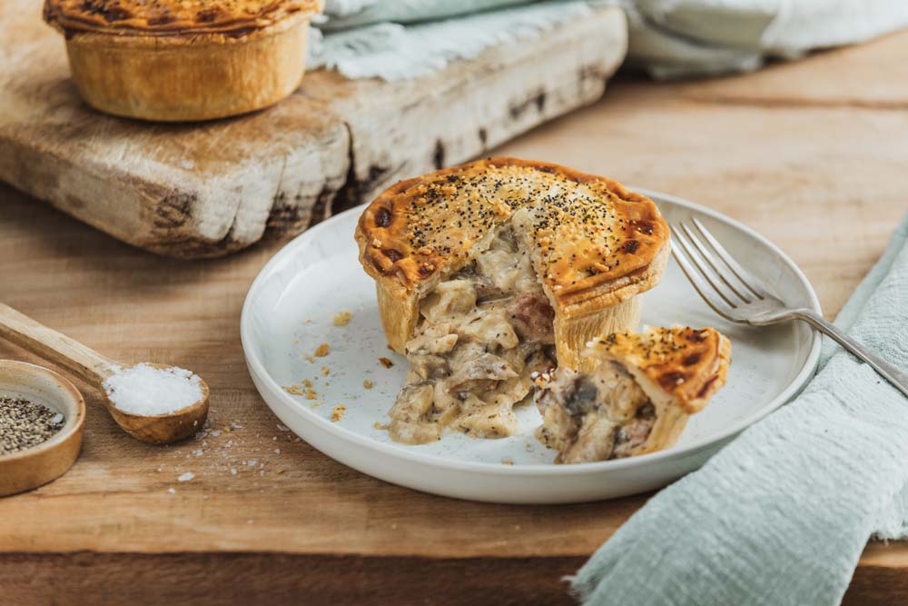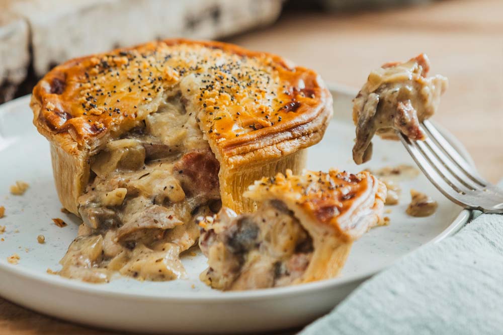 To achieve the perfect balance of flavours, we allow the filling to slowly develop its full, savoury depth. The slow-cooking process thickens and reduces the sauce, intensifying the natural flavours of the chicken, bacon, and mushrooms. This careful approach ensures that each bite delivers a harmonious blend of tender chicken, and hearty mushrooms, all encased in a golden, all-butter pastry. It's this attention to detail and time that sets our pies apart, creating a truly exceptional taste experience.