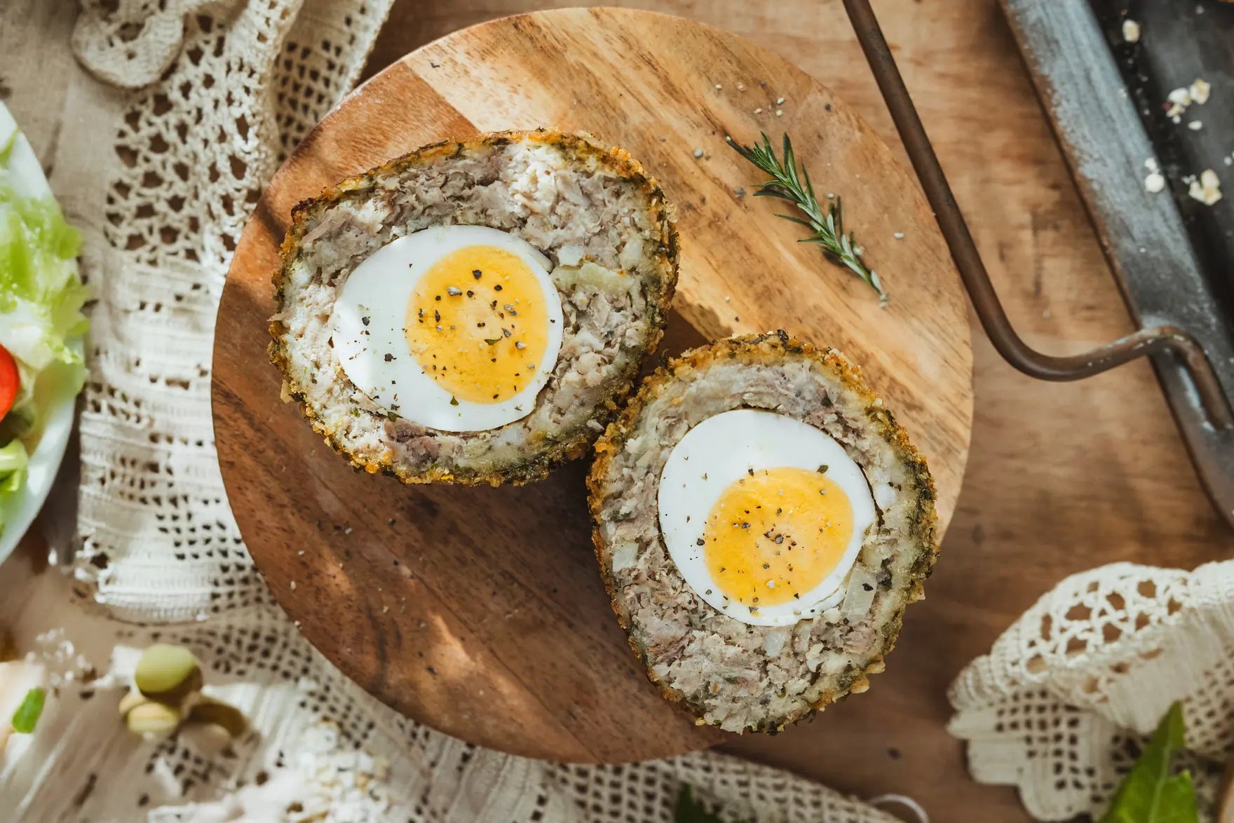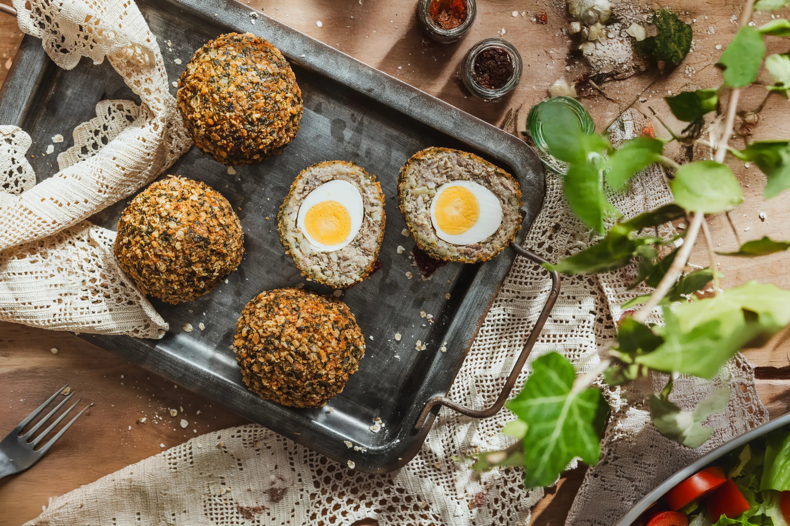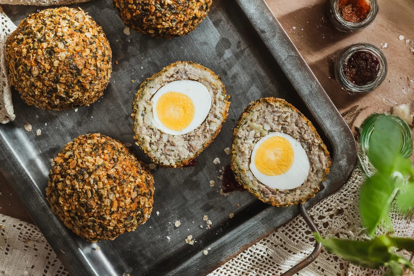 Each handcrafted Scotch egg features a free-range hard-boiled egg, encased in a savoury blend of seasoned minced pork, tender pulled pork, sweet apple, and fragrant sage. Coated in golden breadcrumbs and cooked to a crisp finish, it offers the perfect balance of herby warmth and countryside comfort in every bite.