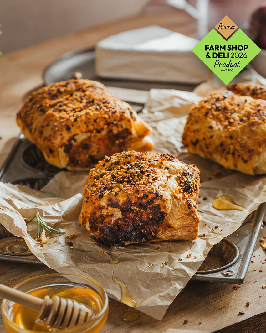 Our Hot Honey GourmetRoll is a luxurious twist on the classic sausage roll, crafted to delight discerning café and deli customers. Encased in golden, flaky all-butter puff pastry, each bite reveals a harmonious blend of rich British pork and smoky bacon, delivering a hearty and satisfying base.