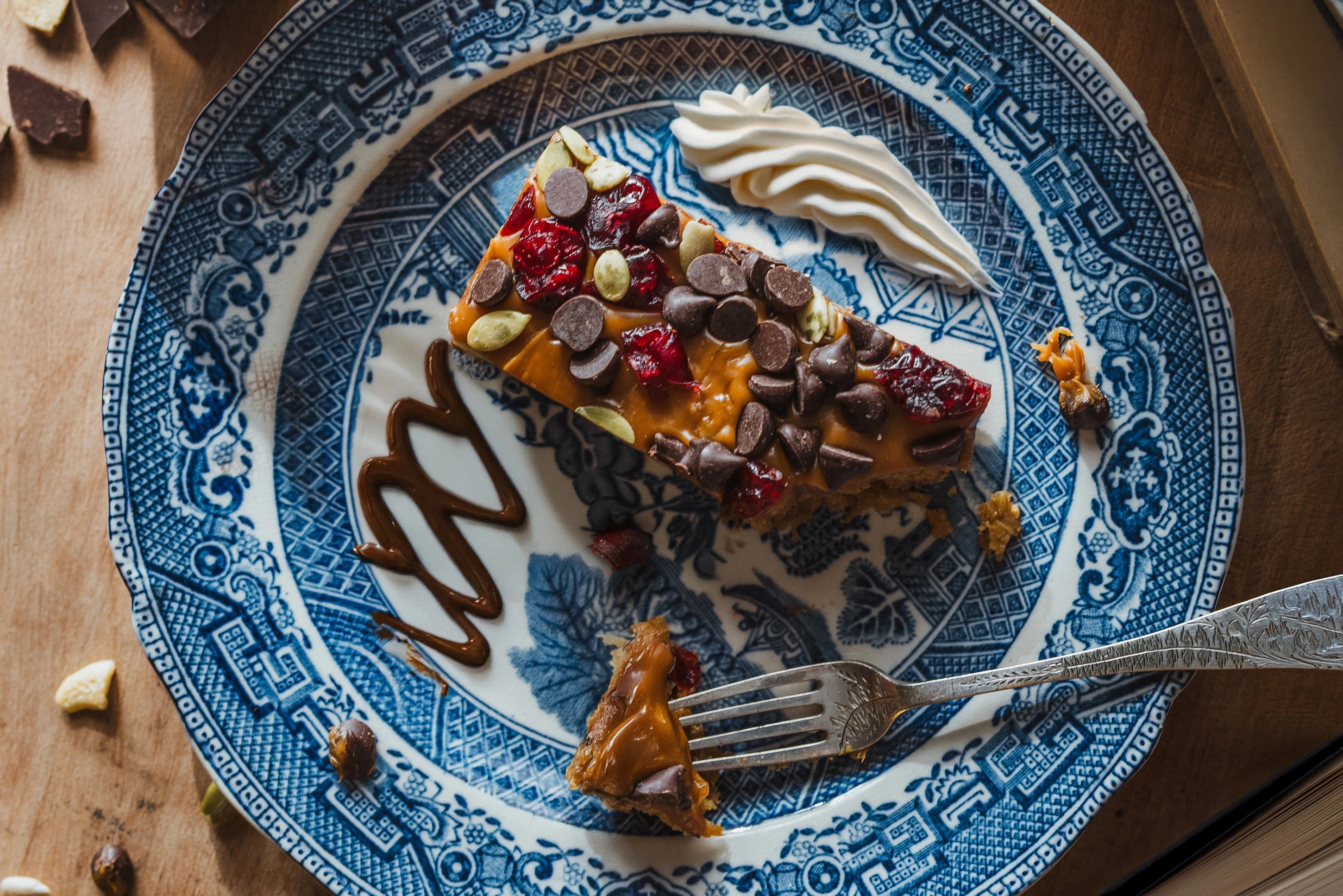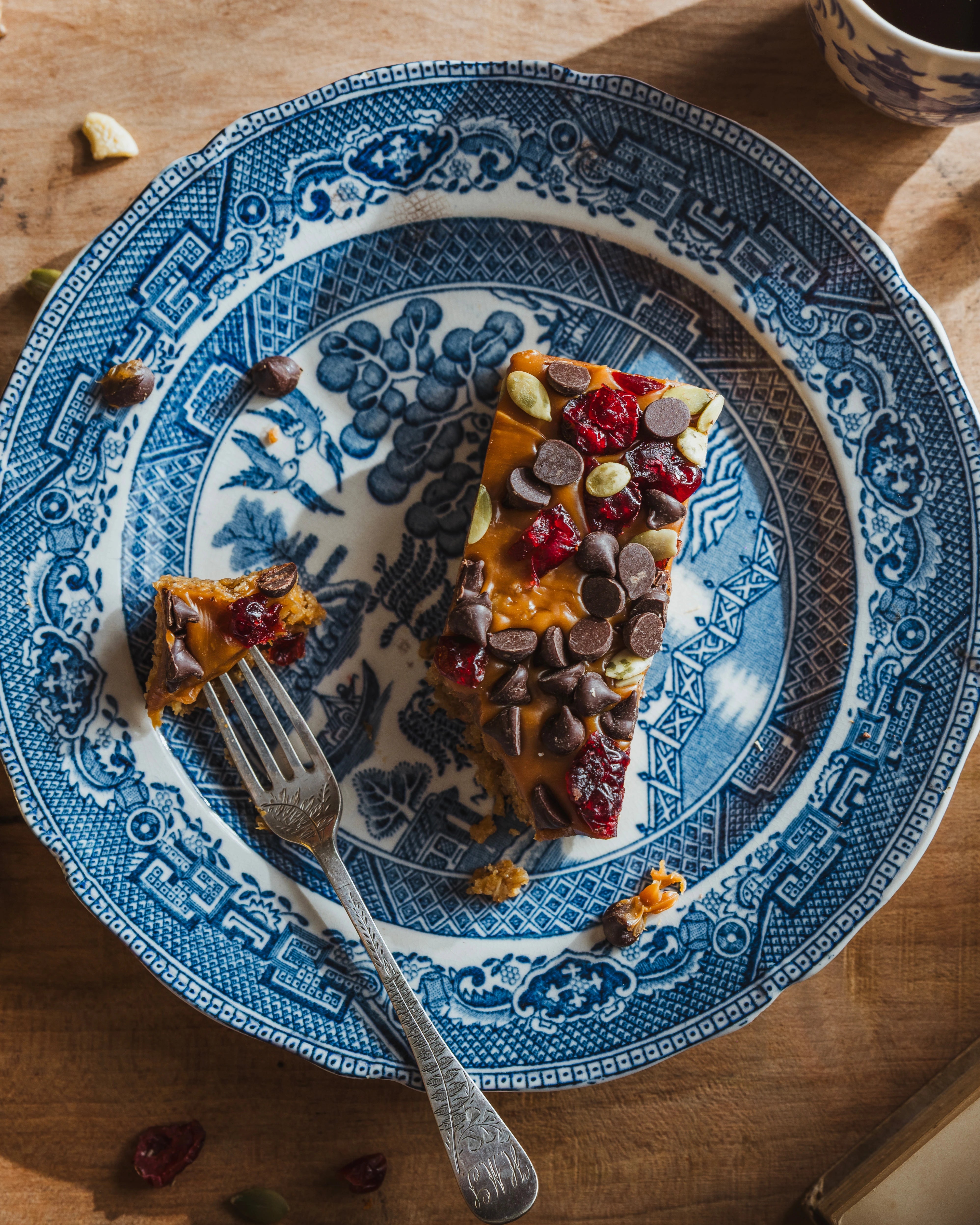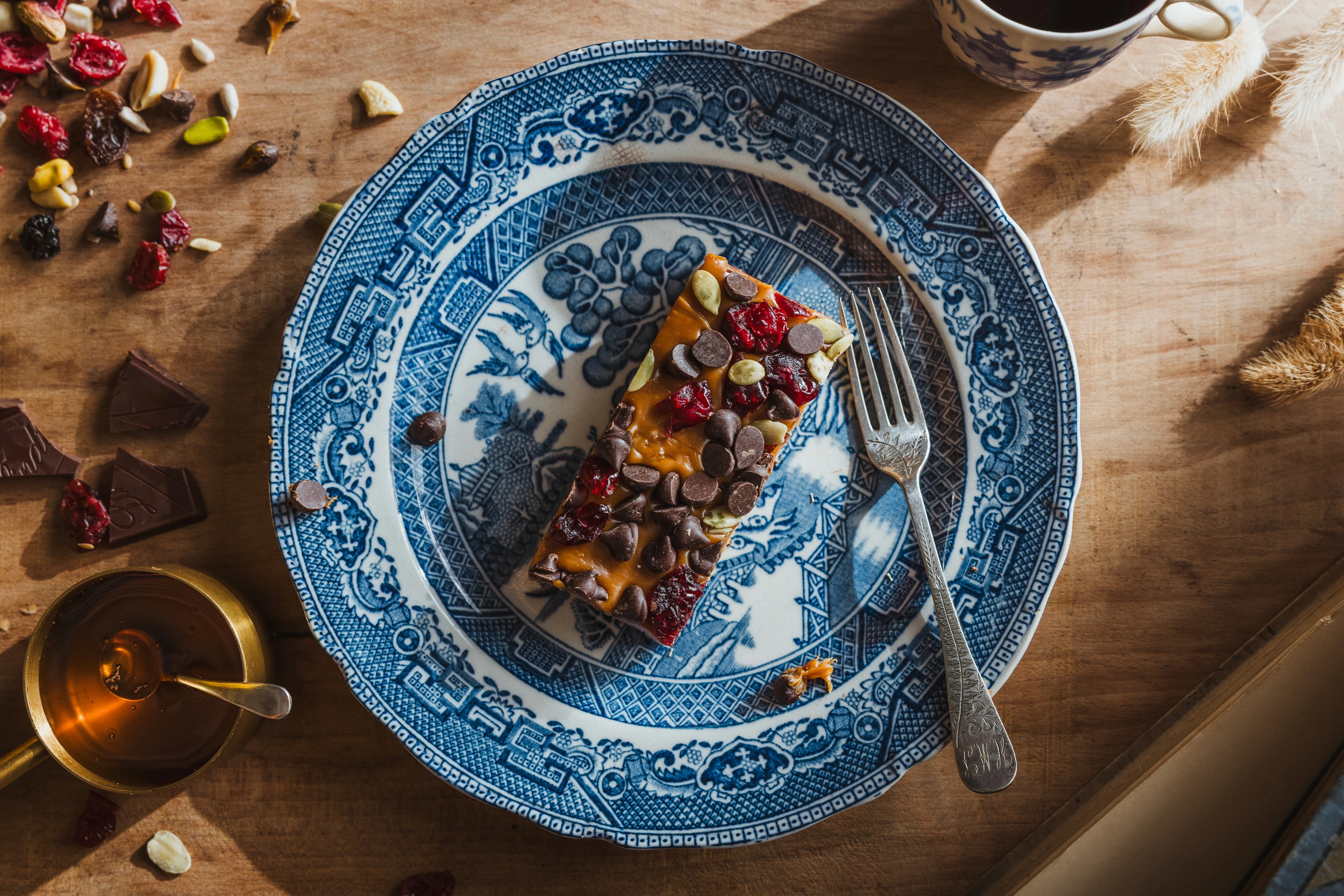 Topped with Caramel & Dark Chocolate – With cranberries and pumpkin seeds for flavour & crunch