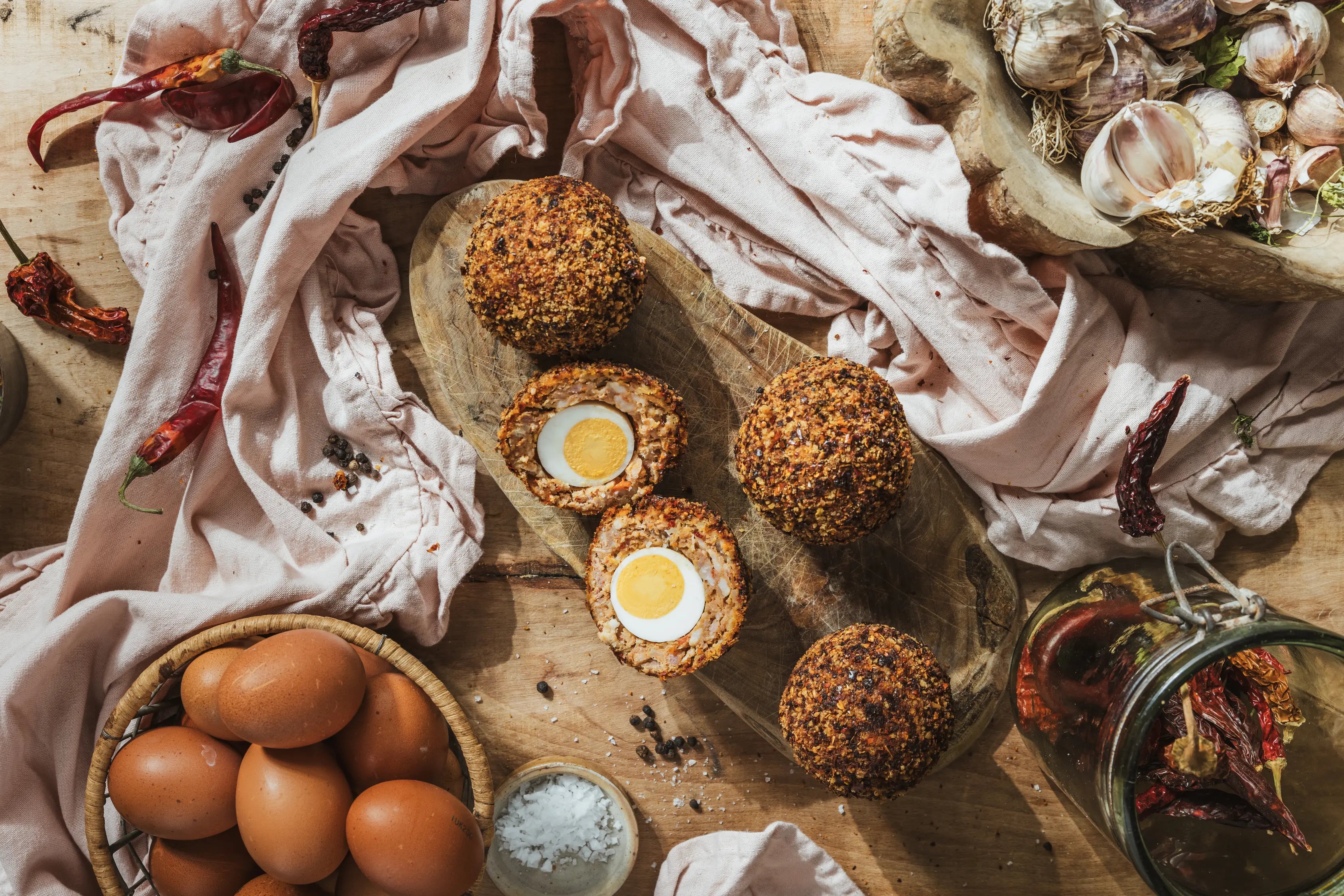 Each handcrafted Scotch egg features a free-range hard-boiled egg, wrapped in juicy pork sausage meat and a medley of sweet red and yellow peppers, blended with a generous swirl of sweet chilli sauce. Coated in a golden breadcrumb shell and cooked to crispy perfection, it strikes a delicious balance of sweetness, savoury richness, and gentle heat in every bite.