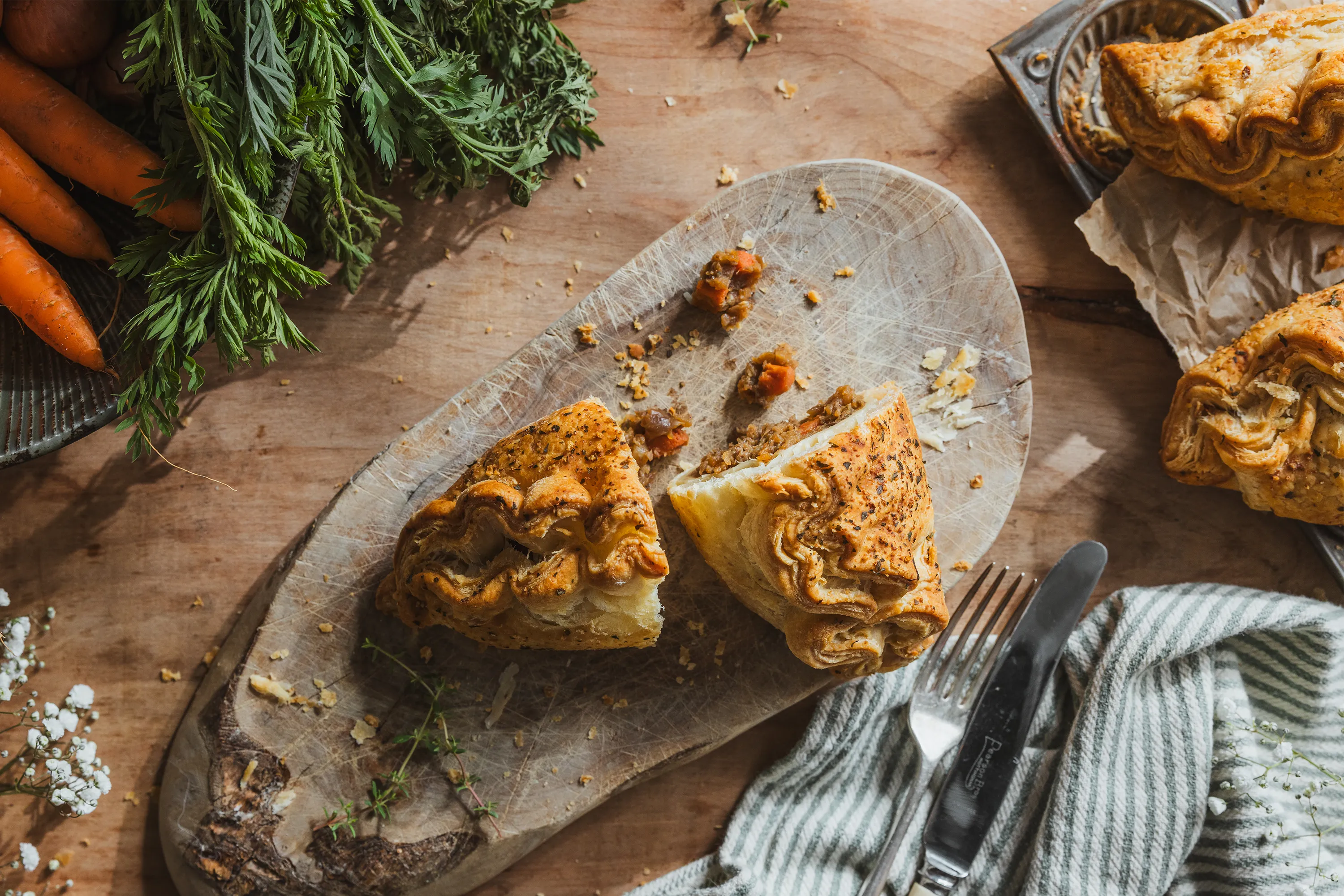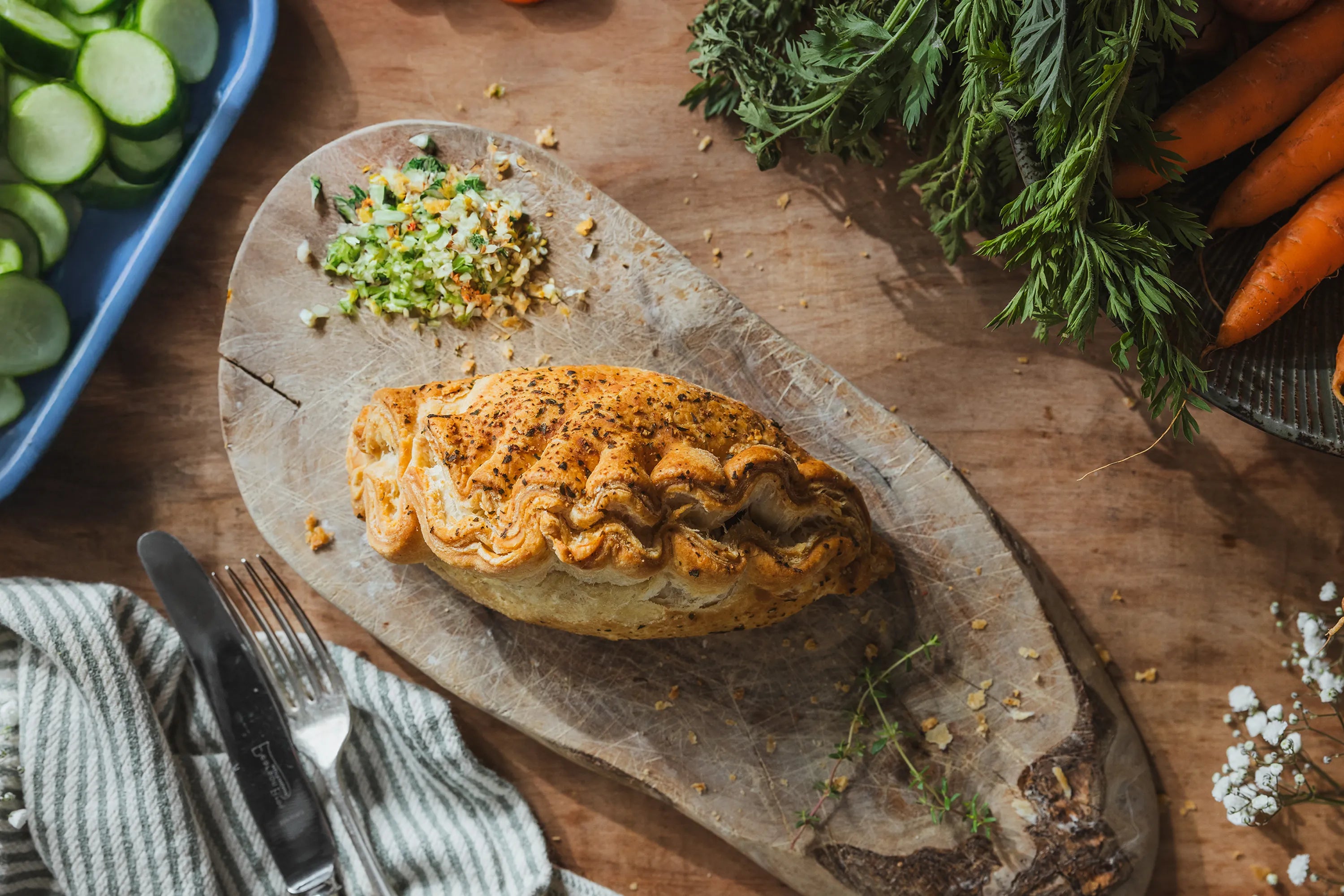 Our Hearty Root Vegetable Puff Pastry is a flavour-packed vegan alternative that doesn’t compromise on taste. Filled with a hearty blend of mushrooms, carrots, swede, potato, and red onion, gently seasoned to enhance their natural sweetness. This pasty is wrapped in golden, flaky vegan puff pastry and finished with a soya milk glaze, crunchy breadcrumbs, and a sprinkle of dried parsley. Supplied frozen for bake-off in-store, it’s a convenient and satisfying meat-free option ideal for display counters, takeaway, or eat-in menus.